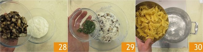 Add the sautéed mushrooms to the bechamel 28 and the thyme leaves 29. Meanwhile, cook the pasta 30.