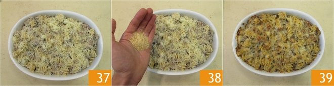Finish by sprinkling the remaining Casera 37 and breadcrumbs 38 on top. Bake in a preheated oven at 428°F for 15 minutes, then turn on the grill for 5 minutes. Take it out of the oven 39 and serve your baked pasta with mushrooms and sausage!