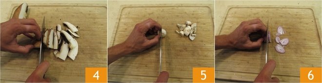 Cut the portobello mushrooms into slices 4 and the button mushrooms into quarters 5. Move on to the shallot, clean it, and slice it thinly 6.