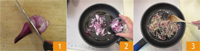 To prepare baked pasta with spinach and ricotta, heat a little oil in a pan, then clean and thinly slice the spring onion 1 before adding it to the pan 2 to stew over low heat 3.