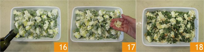 Incorporate also half of the ricotta 13. Mix and transfer half of the dressed pasta into a baking dish 14, add a few dollops of ricotta 15, and cover with the remaining pasta.