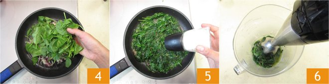 Add the washed spinach leaves 4 and cook over high heat for 2 minutes. Remove from heat and adjust with salt 5 and pepper. Transfer the cooked spinach to a tall glass, add a little extra virgin olive oil, and blend with an immersion blender 6.
