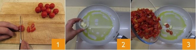 To prepare baked penne with tomato and ricotta, start by preparing the sauce. Wash the cherry tomatoes and cut them into quarters, then pour the oil along with the garlic into a large saucepan 2, let it brown over moderate heat, and add the cherry tomatoes 3.