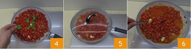Salt and add the basil 4, then cover with a lid 5, let it cook for about 15 minutes, and once cooked, remove the garlic 6 and turn off the heat.