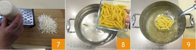 Grate the salted ricotta with a large-hole grater 7 and cook the pasta in plenty of boiling water, salted to taste 8. Drain it al dente 9
