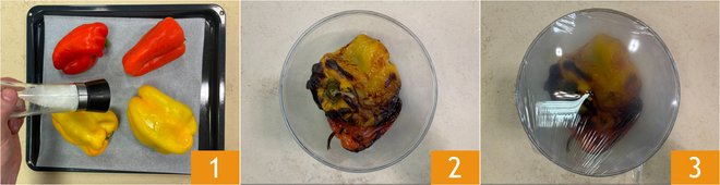 To prepare baked peppers, first place them on a baking sheet lined with parchment paper, then salt 1. Bake in a preheated oven, static function, at 428° F for 50 minutes. Remove from the oven and transfer the peppers to a bowl 2, then cover with plastic wrap 3 and let them cool slightly. The steam will soften the flesh and make peeling easier.