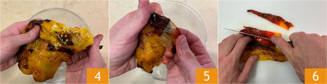 At this point, remove the seeds 4 and peel the peppers 5. Cut the flesh into strips about 0.4 inches thick 6 and gather them in a bowl.