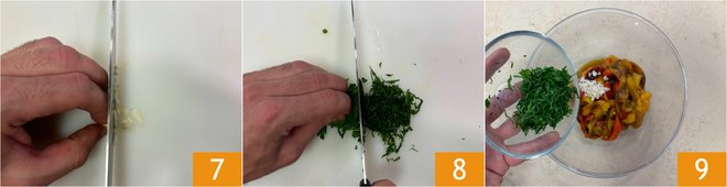 Finely chop the garlic 7 and parsley 8 with a knife, then add them to the peppers 9.