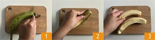 To prepare the baked plantain, first, you'll need to clean the plantain. Cut off and remove the ends of the plantain 1, then make incisions along the peel in various spots to peel it easily 2, remove the peel using a knife if necessary until fully peeled 3
