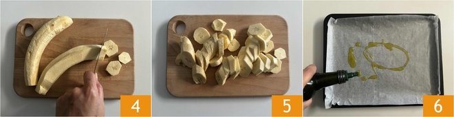 Once you have cleaned the plantain, slice it into pieces not too thin 4, about 1/4 inch thick will be fine. After slicing both plantains 5, line a baking tray with parchment paper and pour a drizzle of extra virgin olive oil over the bottom 6