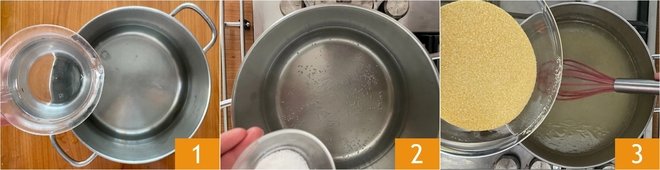 To make the baked polenta, first fill a pot with water 1 and bring it to a boil, then salt it 2 and add the oil. Pour the cornmeal in a steady stream 3 and stir continuously with a whisk to avoid lumps. When the water returns to a boil, lower the heat and cook for about 50 minutes, stirring constantly if possible.