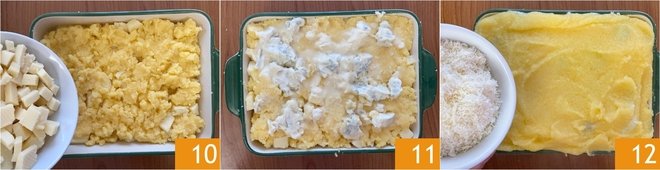 Create another layer of polenta and add the cubes of fontina 10, then cover with a third layer of polenta and fill with the gorgonzola 11. Finish with a final layer of polenta and the grated Grana Padano PDO 12.