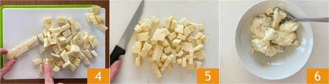 Meanwhile, cut the asiago 4, fontina 5, and gorgonzola 6 into cubes, then grate the Grana Padano PDO.