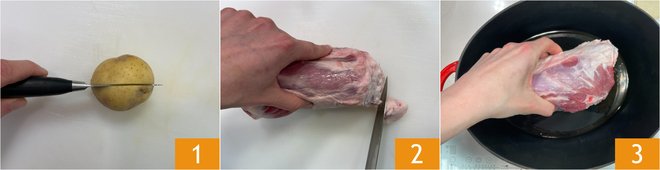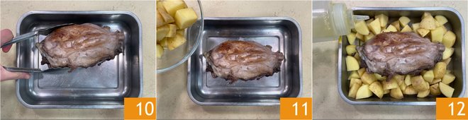 Transfer the shank to a baking dish 10, add the potatoes 11 and the oil 12.
