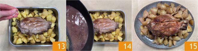 Adjust with salt 13, drizzle with the meat's cooking liquid 14, and bake in a static oven at 392°F for about 1 hour. However, cooking time may vary slightly depending on the size of the shank. For more precision, measure the internal temperature of the meat with a probe, which should be between 167°F and 185°F. Once cooked, transfer the shank and potatoes to a serving dish 15.