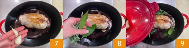 Add the garlic 7 and the herbs 8. Cover with a lid 9 and cook over medium heat for 30 minutes, turning the meat occasionally.
