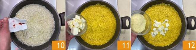 After 10 minutes, add the saffron 10 and mix well, then finish cooking the rice. When the risotto is ready, turn off the heat and stir in cold cubed butter 11 and grated Parmigiano Reggiano PDO 12.