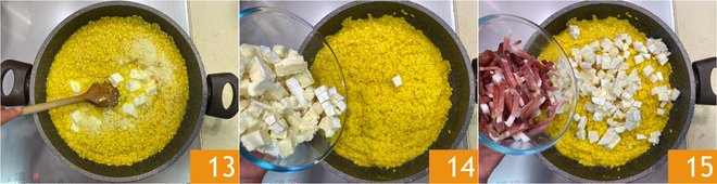 Let it rest for a minute before mixing everything well 13. If it turns out too dry, you can add a little more water. At this point, add the taleggio 14 and speck 15.