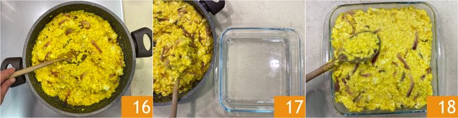 Mix well 16, then transfer the risotto to a 9.5x9.5 inch baking dish 17 and level the surface 18.