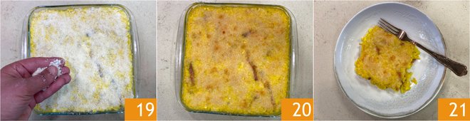 Dust the surface with plenty of grated cheese 19 and cook in a preheated static oven at 450°F for about 20 minutes. When the crust becomes crunchy and golden, remove from the oven 20 and let the casserole rest for a few minutes. Your baked saffron rice with speck and brie is ready to be served 21!