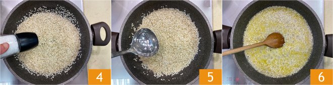 To prepare the baked saffron rice with speck and brie, first bring a pot of water to a boil that you will use to cook the risotto. Heat the oil in a pan 1, then add the rice 2 and toast it for a few minutes, stirring frequently, until it feels hot to the touch 3.