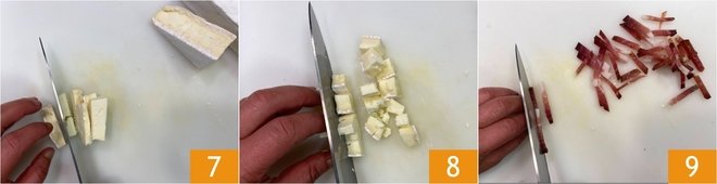 Meanwhile, cut the taleggio first into slices 7 and then into cubes 8. Cut the speck into strips 9.