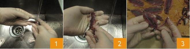 To prepare the baked sardines, start by cleaning the fish (you can use disposable kitchen gloves): under running water, remove the head 1 and, always with your hands, gently open the space between the head and the belly to remove the innards 2. Then, by opening the sardines like a book, you will be able to extract the central bone 3, pulling gently towards the tail.