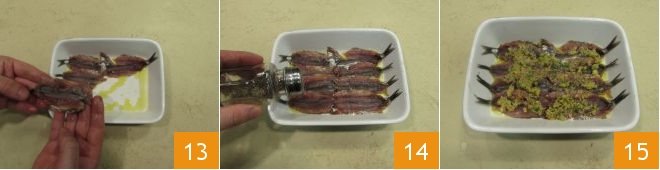 At this point, take a baking dish measuring 7.5x6 inches and drizzle it with about 0.5 oz of oil. Arrange the sardines horizontally without overlapping them 13, salt (not excessively), pepper 14, and cover with half of the previously prepared mixture 15.