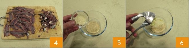 Once all the sardines are cleaned 4, prepare the breading: pour the breadcrumbs, grated cheese 5, and crushed garlic clove 6 into a bowl.