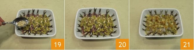 Arrange another layer of sardines, taking care to position them vertically (opposite to before), salt, pepper, and cover with the remaining breading 17 over the entire surface 18.