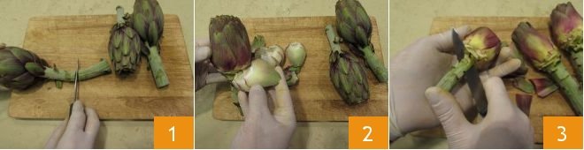 To prepare the baked scad with artichokes and peas, first take care of cleaning the artichokes. Cut off the tougher part of the stem 1 and remove the tougher outer leaves 2 which could be too hard when cooked. Using a sharp knife, peel the stem 3