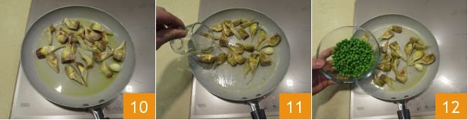 Let them cook over medium-high heat for 5-6 minutes 10, then deglaze with the white wine 11 and once all the alcohol has evaporated, add the peas 12.