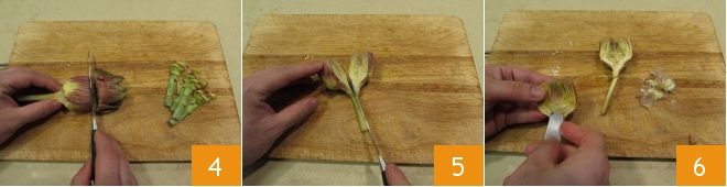 and cut off the tip of the artichoke 4. Cut it in half 5, remove the inner choke 6