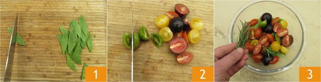 To prepare baked sea bream fillets, first handle the vegetables. After washing them, cut the snow peas into pieces 1 and the colorful cherry tomatoes in half 2. Place in a bowl and season with rosemary 3.