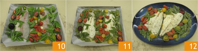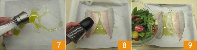 In a baking dish lined with parchment paper, drizzle some oil, salt 7, and pepper. Place the sea bream fillets on top and season them with a sprinkle of pepper 8 and salt. Add the vegetables as well 9.