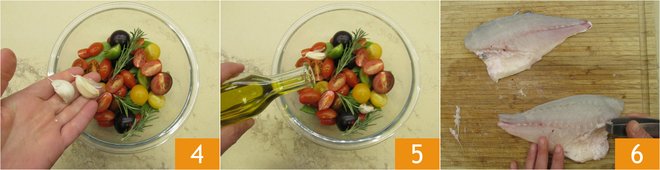 Add garlic 4, oil 5, salt, pepper, and mix to flavor. Set aside. Take two fillets from about 1.3 lbs of whole sea bream. You can ask your fishmonger to fillet the sea bream for you, or try it yourself by following our cooking school: how to clean sea bream. Check for any bones and, if necessary, remove them with tweezers 6.