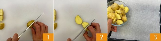 To prepare the baked sole rolls, wash the new potatoes well and, if they are small, cut them in half 1; if they are slightly larger, divide them into four wedges 2. Transfer them onto a baking sheet lined with parchment paper 3.