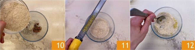 Transfer to a bowl and add the breadcrumbs 10. Also add the grated lemon zest 11, adjust the salt and pepper, then mix well until you obtain an aromatic and homogeneous mixture 12.