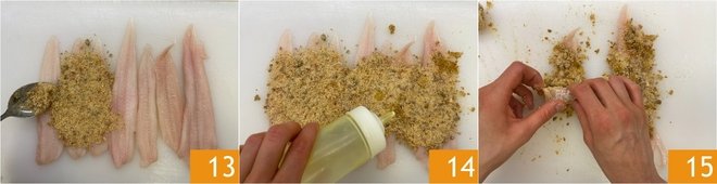 Lay out the sole fillets on a work surface and spread a bit of the breadcrumb mixture on each one 13. Add a drizzle of oil 14. Roll the fillets gently, one at a time 15, to form small rolls, trying to keep them compact.