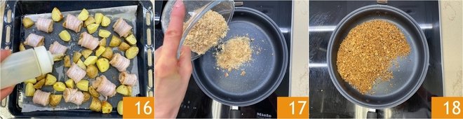 After 20 minutes of cooking the potatoes, remove the baking sheet from the oven and place the sole rolls in it. Add a drizzle of oil and bake for another 10 minutes. Meanwhile, if you have leftover flavored breadcrumb mixture, toast it in a pan 17 over medium heat until it becomes crispy and golden 18: this will be an extra touch to add to the final dish.