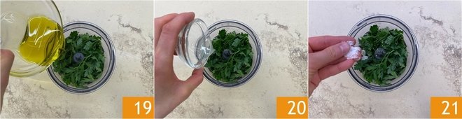 Prepare the green sauce: place the parsley, garlic, extra virgin olive oil 19, juice of half a lemon 20, a pinch of salt 21, and a grind of pepper into a blender cup.