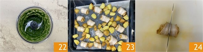 Blend until you obtain a smooth and fragrant sauce 22, adding a bit of water if necessary to adjust the consistency. Once the fish is ready, take it out 23 and cut the rolls in half 24.