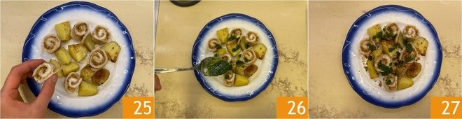Serve the sole rolls hot, accompanied by roasted new potatoes 25. Complete with a few spoons of green sauce 26, toasted bread for a crunchy note, and a few fresh marjoram leaves for garnish 27.