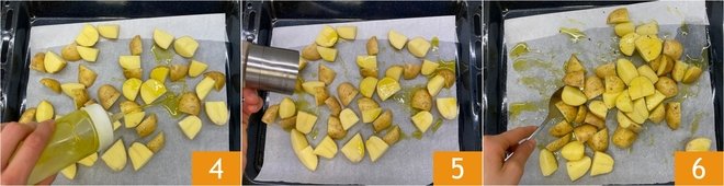 Season them with extra virgin olive oil 4, salt, and pepper 5, and mix well 6. Then, bake in a preheated static oven at 392°F for about 20 minutes.
