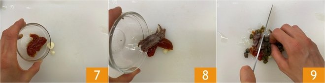 In the meantime, place the peeled garlic clove, sun-dried tomatoes 7, anchovy fillets 8, and desalted capers on a cutting board. Finely chop everything with a knife 9.