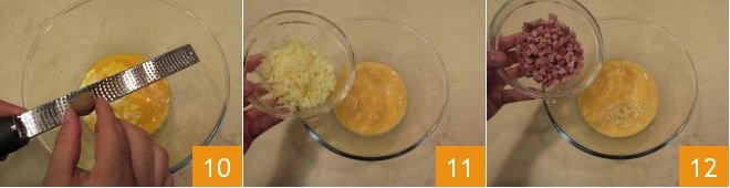 Add the salt, pepper, nutmeg 10, provolone cubes 11, and ham cubes 12.