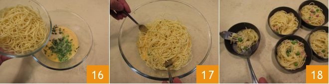 Finally, add the cooked spaghetti 16 and mix everything together until all the ingredients are combined 17. Divide the resulting mixture into 8 molds, each with a diameter of 4 inches 18.