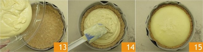 Retrieve the pan and pour the cream mixture over the biscuit base 13, then level the surface with a spatula 14. Bake in a preheated static oven at 330°F for about 50 minutes. Once baked, remove from the oven and let cool completely at room temperature 15.