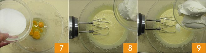 In the meantime, you can start on the filling: pour the eggs and sugar into a large bowl 7 and whisk with an electric mixer until you get a smooth and well-whipped mixture. Continuing to whisk, add the cream cheese 8 and mascarpone 9.
