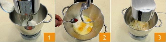 To prepare the baked tagliatelle casserole, start with the fresh egg pasta: in the bowl of a stand mixer equipped with a dough hook, add the sifted flour 1, eggs, and a pinch of paprika 2. Turn on the mixer to work the ingredients 3.